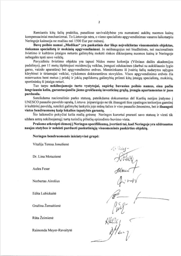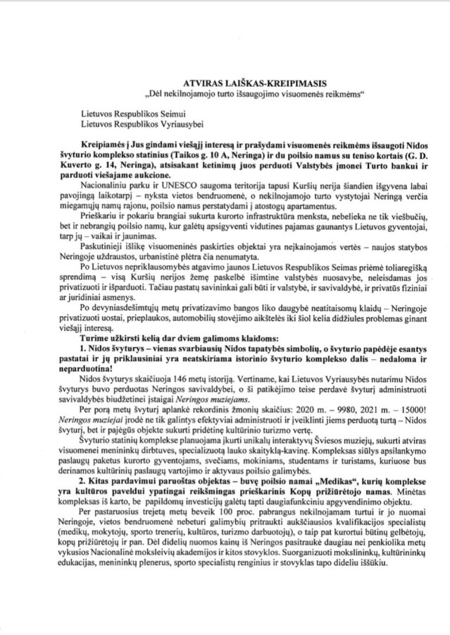 Su atviro laiško-kreipimosi turiniu susipažinti bei jį pasirašyti dvi savaites bus galima Neringos savivaldybės Viktoro Miliūno viešojoje bibliotekoje Nidoje (Pamario g. 53) ir jos filialuose – Juodkrantėje (Ievos kalno g. 9), Preiloje (Preilos g. 27), taip pat Juodkrantės Liudviko Rėzos kultūros centre (L. Rėzos g. 8B), Pervalkos Karaliaus Mindaugo profesinio mokymo centre (Pervalkos g. 1), Kuršių nerijos nacionalinio parko lankytojų centre Nidoje (Naglių g. 8). Su minėto rašto turiniu galima susipažinti ir internetinėje erdvėje – Neringos savivaldybės puslapyje bei Facebook paskyroje, taip pat Neringos grupėse socialiniuose tinkluose.