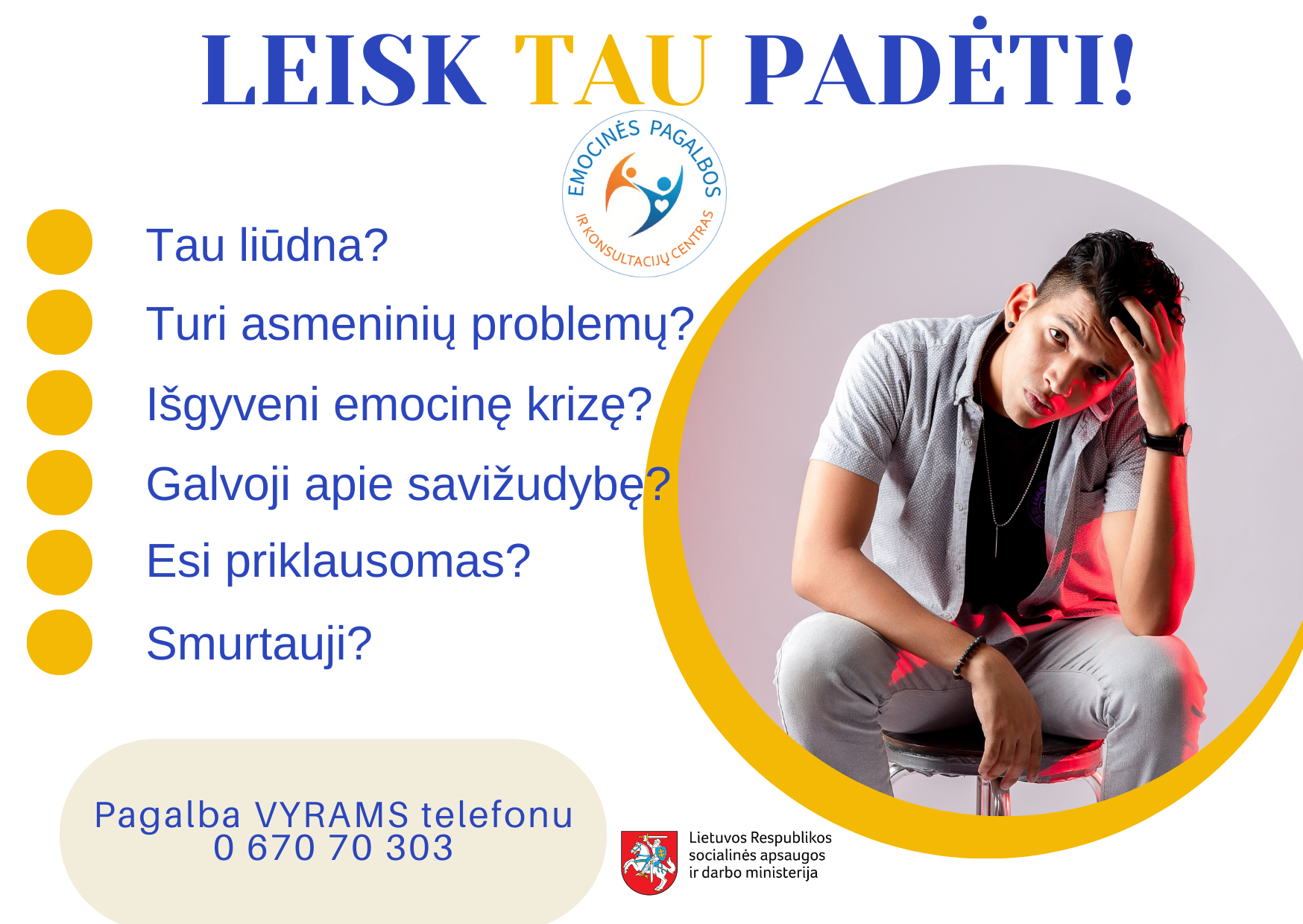 Emocinės pagalbos ir konsultacijų centras teikia specializuotą kompleksinę (psichologinę, socialinę ir teisinę) pagalbą VYRAMS, esantiems sudėtingoje psichologinėje situacijoje, t. y. dėl ekonominių, socialinių ar asmeninių sunkumų išgyvenantiems emocines ir/ar psichologines krizes, įskaitant savižudybės, smurto, priklausomybių riziką. Pagalba teikiama telefonu ir/ar kitomis nuotolinio bendravimo priemonėmis (internetu ir/ar elektroniniais laiškais, ir/ar žinutėmis).
