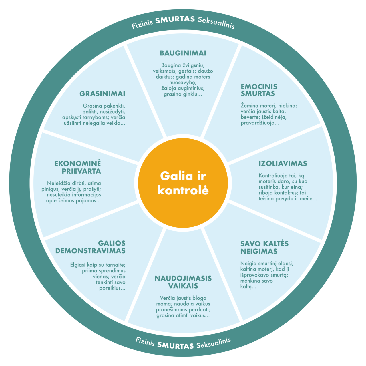 Galios ir kontrolės rato viduje ratu išdėstytos aštuonios sisteminio smurto taktikos. Naudodamas vieną ar kelias jų, smurtautojas sistemingai stengiasi kontroliuoti partnerės mintis, įsitikinimus ir elgesį, siekia įbauginti.