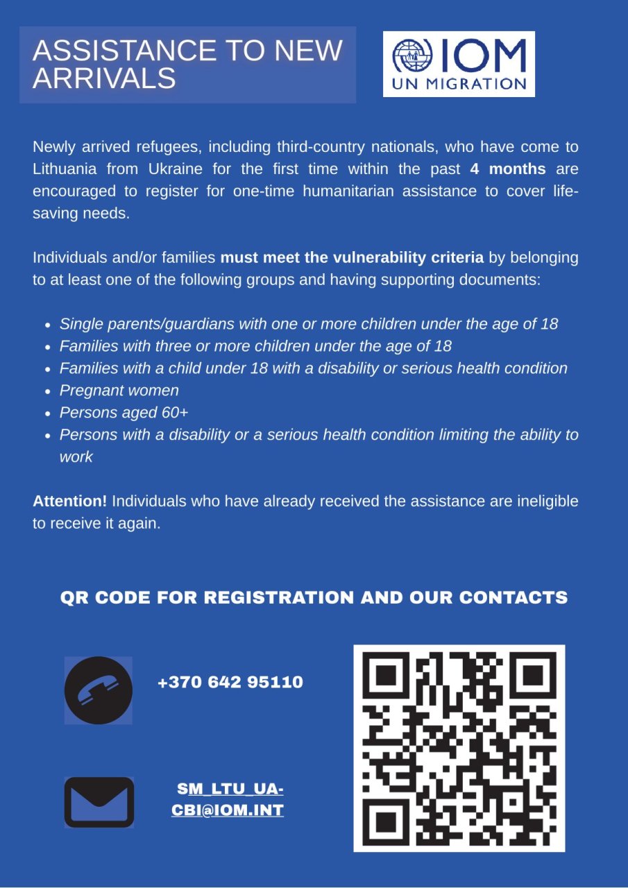Informuojame, kad IOM Lietuva teikia vienkartinę humanitarinę pagalbą naujai į Lietuvą atvykusiems pažeidžiamiems Ukrainos karo pabėgėliams.
